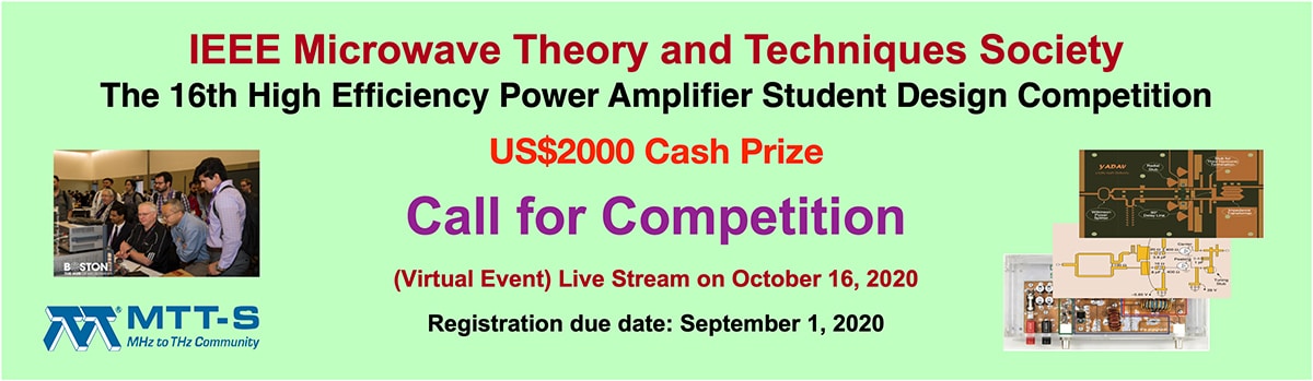 The IEEE MTT-S Microwave High Power Techniques Committee (MTT-12), in collaboration with Keysight Technologies, is pleased to announce that the 16th High Efficiency Power Amplifier (HEPA) Student Design Competition (SDC) will take place on Friday October 16th, 2020. The competition will be held virtually. Live measurements of the contestant’s PAs will be streamed online in real-time. The contestants will be able to participate virtually during the live event.