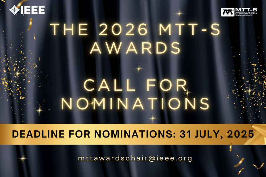 The deadline for nominations for the 2026 MTT-Society Awards is 31 July, 2025. Nomination forms can be downloaded from the individual awards‘ descriptions presented at https://mtt.org/ieee-and-mtt-s-awards/, where further general and specific information is given, and shall be submitted to mttawardschair@ieee.org.